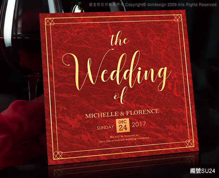 【Su24】紫羅紅大理石-紅色婚宴喜卡-方形喜帖婚卡