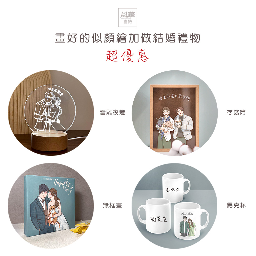 4.若有其他繪製需求(ex.改變臉部線條、將新人服裝繪製成婚紗禮服、增加寵物及人物等),將另報價費用。