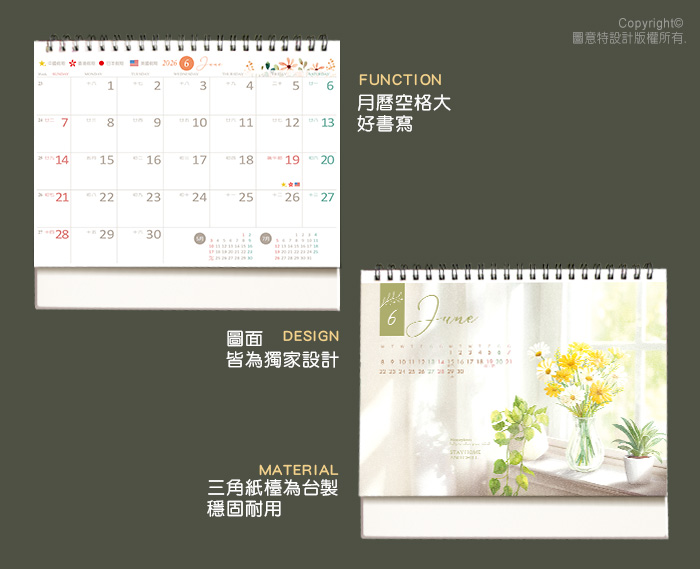 | 紙質 | 150g道林紙,手感溫潤.好書寫(彩色雙面印刷) | 桌曆材質 | 底座:白色(高級上霧膜紙質.裱褙硬紙板) 線圈:黑色雙鐵線圈 |