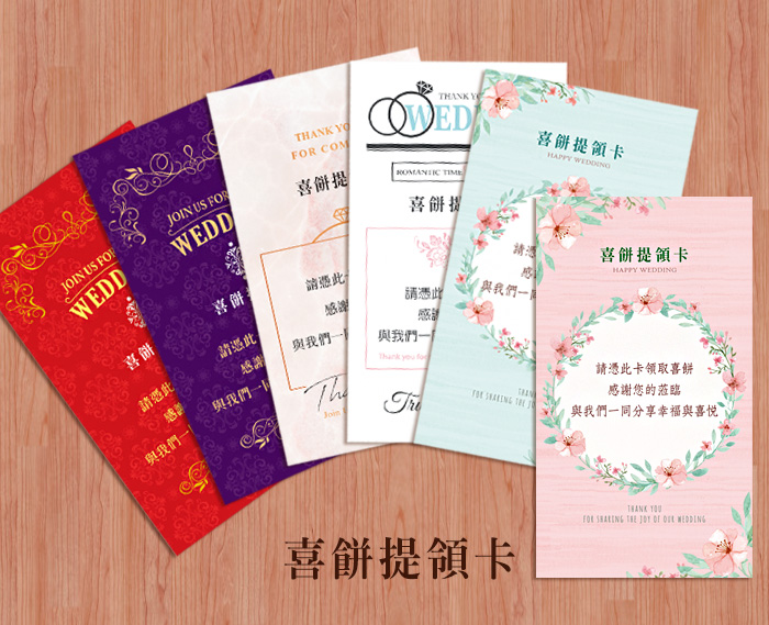 【製作時間】 喜餅提領卡有現貨,寄出後1~2日您可收到。或預約來風華喜帖購買現貨。 【注意事項】 個人螢幕顯示器設定不同,印刷成品與螢幕色差為正常現象,不因色差而退貨或重印。 【免運費】 訂購喜帖加購婚禮小物、刮刮卡、結婚書約夾等,滿額5000元享優惠免運費。(全品項需同筆訂單,運費不列入滿額計算,單訂購喜帖則無免運優惠)